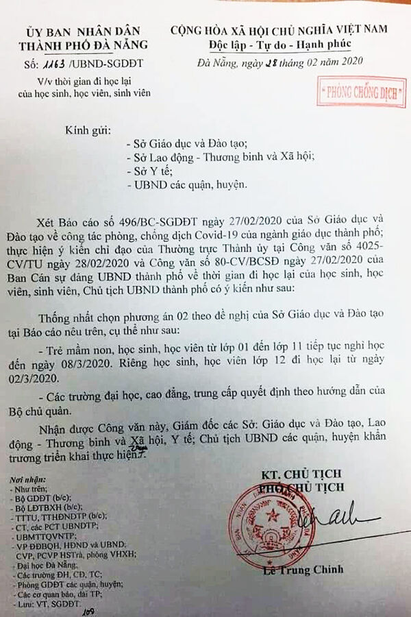 VNHN - Hôm nay 28/02/2020, UBND thành phố Đà Nẵng đã có tiếp công văn về việc quay trở lại trường học của học sinh sinh viên trên địa bàn thành phố.