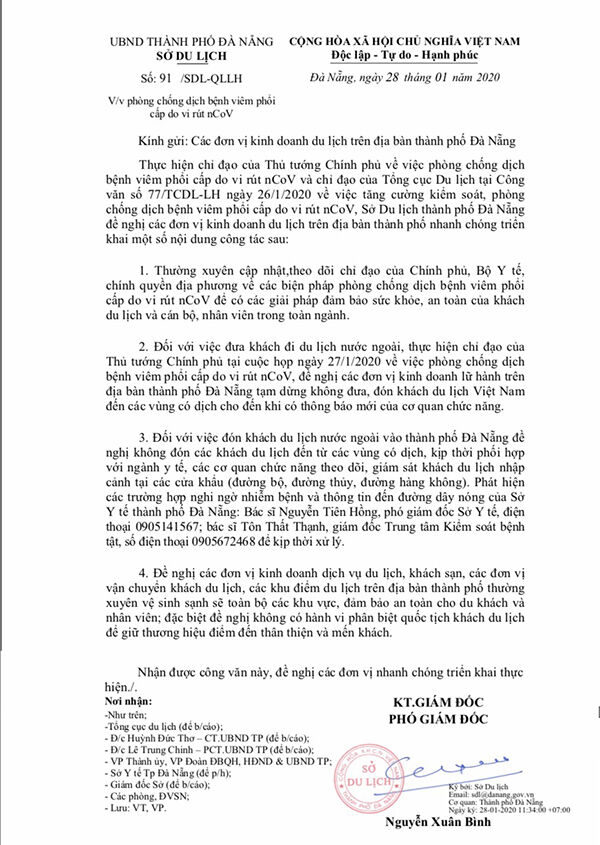 VNHN - Hôm nay ngày 28/01/2020, ông Nguyễn Xuân Bình, Phó giám đốc sở Du lịch Đà Nẵng đã ký công văn số 91 gởi các đơn vị lữ hành, du lịch địa bàn, yêu cầu dừng đưa đón du khách trong nước đến các vùng có dịch bệnh, và dừng đón du khách từ các vùng có dịch bệnh.