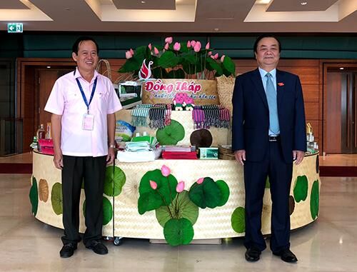 Ông Lê Minh Hoan - Ủy viên Trung ương Đảng, Bí thư Tỉnh uỷ, Trưởng Đoàn Đại biểu Quốc hội tỉnh Đồng Tháp (bên phải) - quảng bá sản phẩm đặc trưng của Đồng Tháp bên lề Nghị trường Quốc hội.
