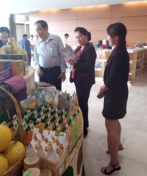 Chủ tịch Quốc hội Nguyễn Thị Kim Ngân (giữa) và ông Trần Thanh Mẫn - Chủ tịch Ủy ban Trung ương MTTQ Việt Nam cùng các Đại biểu tham quan gian hàng trưng bày "đặc sản" Đồng Tháp tại Toà nhà Quốc hội.