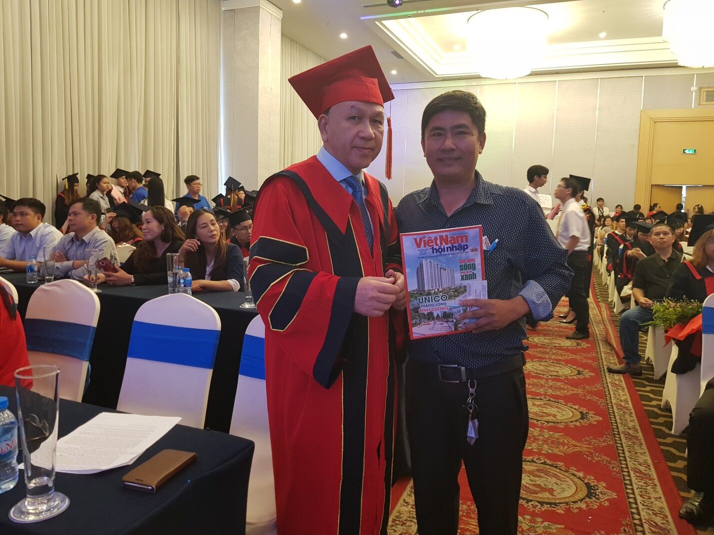 Phóng viên tặng ấn phẩm Tạp chí "Việt Nam Hội Nhập" đến Hiệu trưởng Nhà trường.