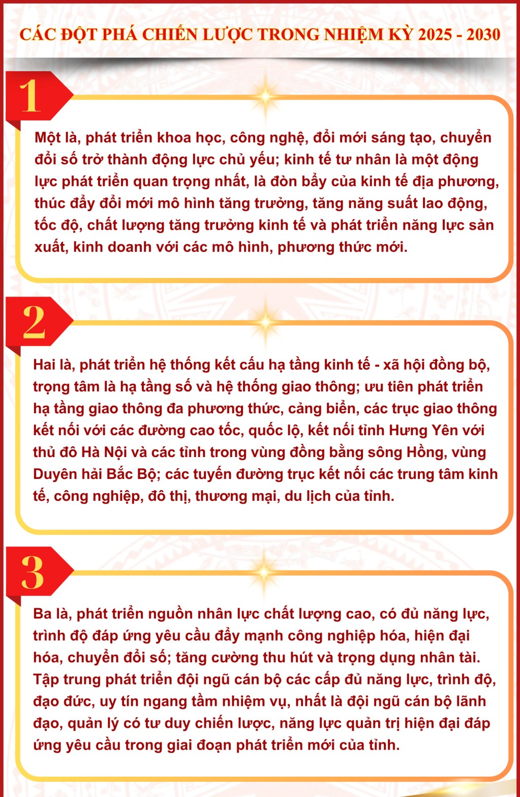 Đại hội đề ra mục tiêu đến năm 2030, tầm nhìn chiến lược đến năm 2045 “Xây dựng tỉnh Hưng Yên có nền kinh tế năng động và phát triển nhanh, bền vững, trở thành tỉnh công nghiệp hiện đại thuộc nhóm dẫn đầu cả nước; trở thành trung tâm kinh tế biển mạnh của phía Bắc; thành phố thông minh, sinh thái trực thuộc Trung ương”. Đây là mục tiêu hết sức lớn lao; nhiệm vụ rất nặng nề với nhiều khó khăn, thách thức nhưng thế hệ chúng ta hôm nay rất tự hào được gánh vác sứ mệnh lịch sử vinh quang, vẻ vang này. Để xây dựng một Hưng Yên giàu đẹp, hiện đại, văn minh, phồn vinh, thịnh vượng, Nhân dân có cuộc sống tốt đẹp và hạnh phúc, chúng ta nhất định phải thực hiện thành công Nghị quyết Đại hội Đảng bộ tỉnh Hưng Yên lần thứ nhất, nhiệm kỳ 2025 – 2030, đáp lại sự mong đợi và kỳ vọng của Nhân dân.