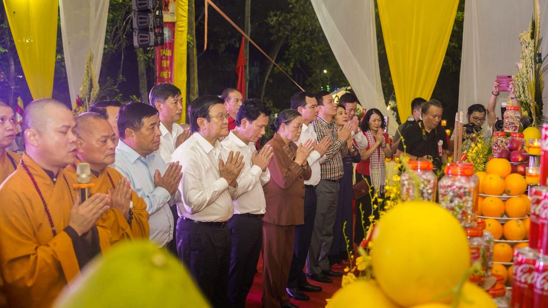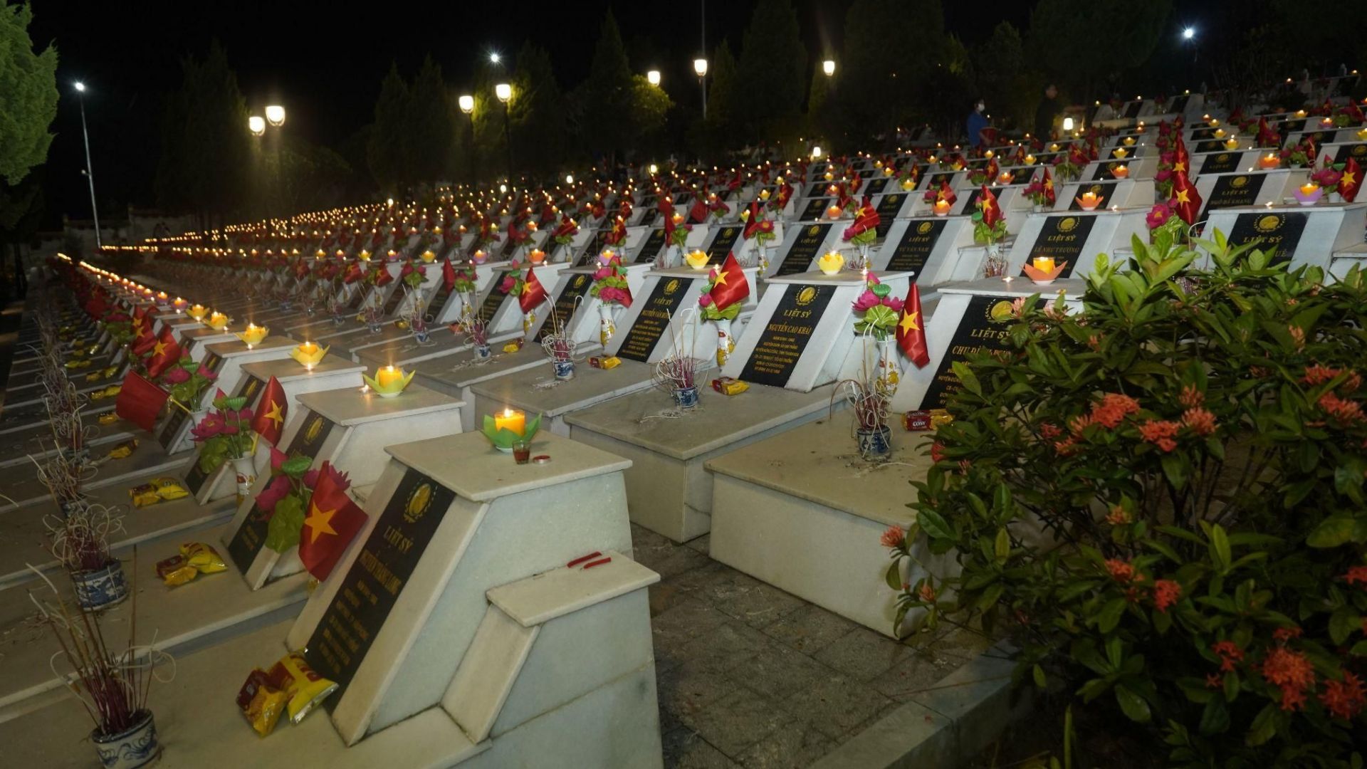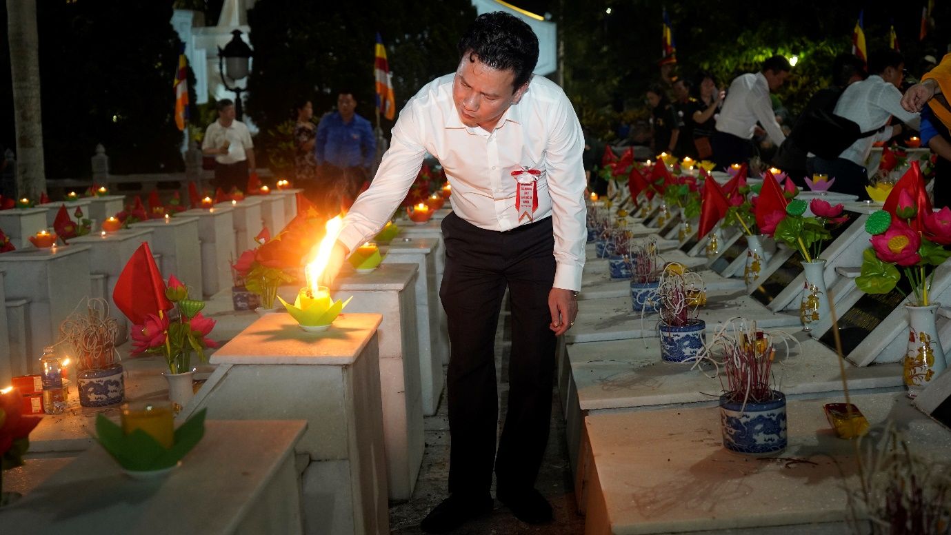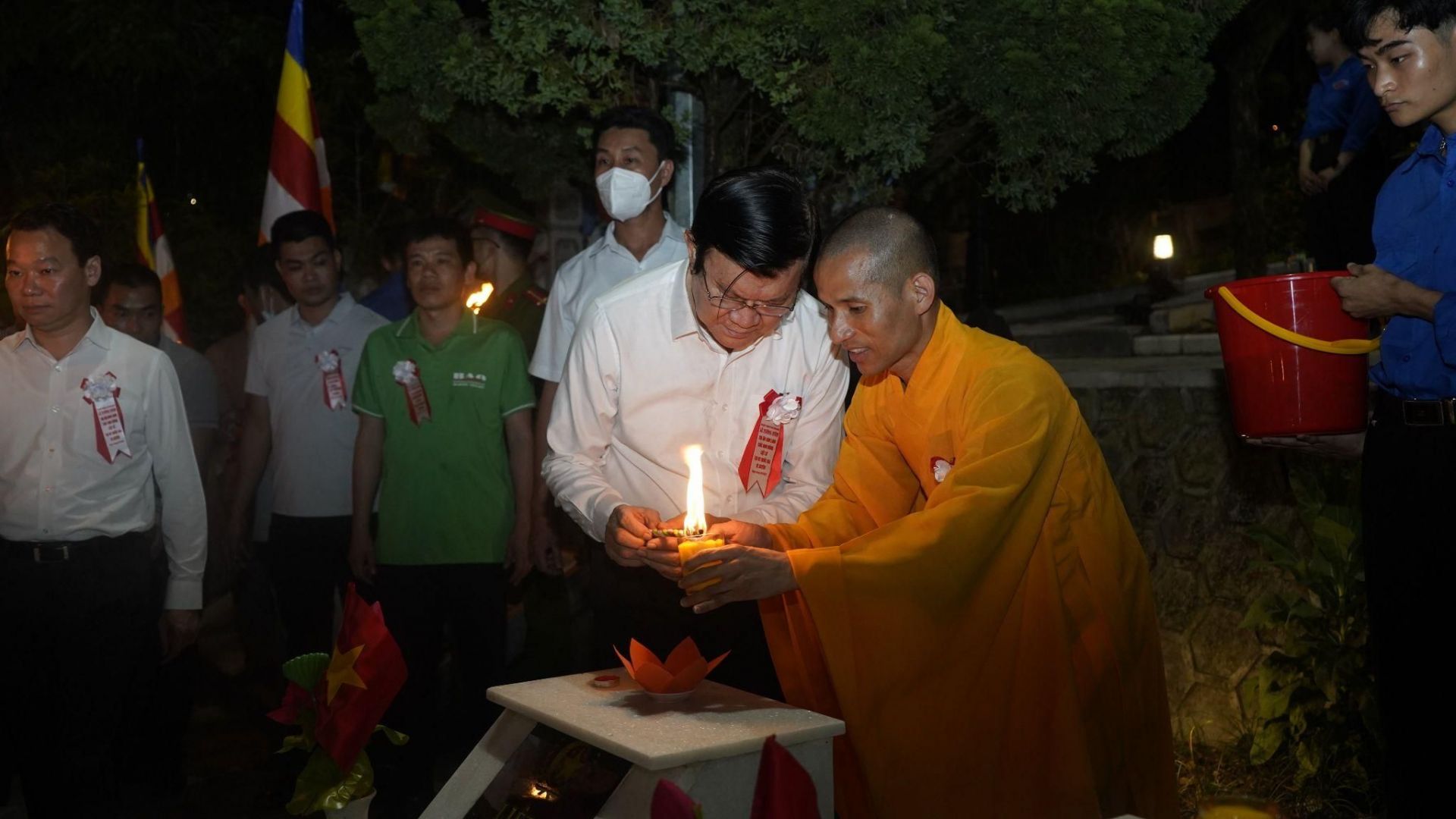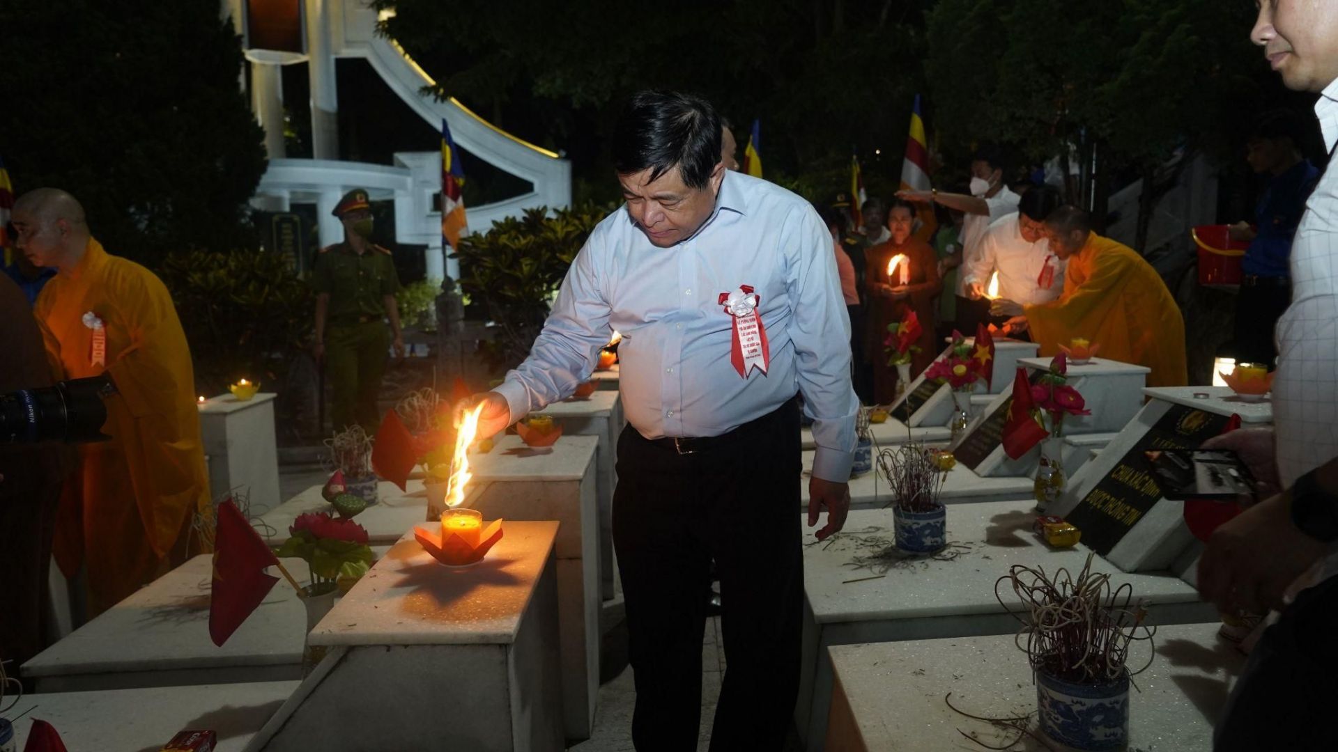 Nguyên Chủ tịch nước Trương Tấn Sang cùng các đồng chí lãnh lãnh đạo trung ương và Hà Giang thực hiện nghi lễ bái Phật dâng hương và truyền Đăng đốt nến tri ân trên những phần mộ của các anh hùng liệt sỹ