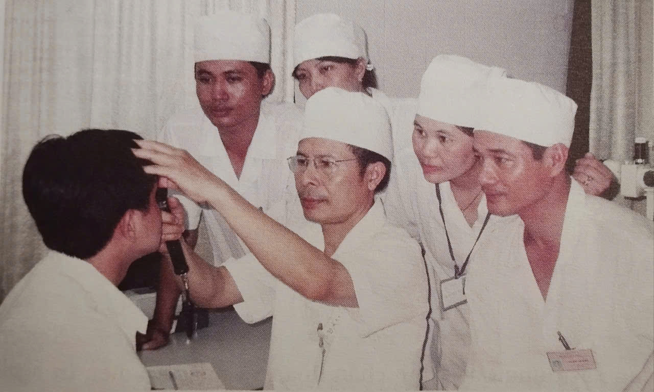 Đặc biệt, ông không nhớ hết mình đã khám và điều trị các bệnh lý về mắt cho bao người khỏi bệnh. Chỉ biết rằng người bệnh khỏe mạnh, nhìn rõ, thấy được ánh sáng là ông thấy vui và đó là phần thưởng để ông tiếp tục cống hiến với nghề. Nhâm nhi chén trà ấm, ông kể cho chúng tôi nghe về 02 đề tài ông thực hiện đầu tiên tại Việt Nam. Đó là năm 1999 đề tài: “Ghép vùng rìa để tái tạo tổn thương giác mạc sau bỏng” đã gây tiếng vang trong ngành. Và đề tài thứ hai là: những năm đầu thế kỷ XXI, có nhiều bệnh nhân bị bệnh về mắt liên quan đến tuyến giáp, bệnh mắt- Basedow đến điều trị tại khoa Mắt, BVQY 103 được ông nghiên cứu và ứng dụng thành công trong điều trị. Và ca mổ hạ áp hốc mắt điều trị lồi mắt có chèn ép thần kinh thị giác của bệnh nhân bệnh nhãn giáp đã được ông thực hiện thành công đầu tiên ở nước ta là năm 2001. Ca phẫu thuật đã thúc đẩy ngành mắt trong việc ứng dụng nghiên cứu điều trị các chứng lồi mắt, co rút cơ nâng mi, lồi mắt kèm theo giảm thị lực, rối loạn vận nhãn và lác của bệnh nhãn giáp – một mặt bệnh tuy ít gặp nhưng gây mặc cảm, gây mất sức lao động cho người bệnh. Sau này, ngoài nghiên cứu những đề tài về bỏng mắt, bệnh nhân nhãn giáp, ông chú trọng nghiên cứu và điều trị các bệnh lý mộng thịt và các biện pháp chống tái phát mộng, các tổn thương về chức năng, thực thể của mi mắt, lệ đạo,…