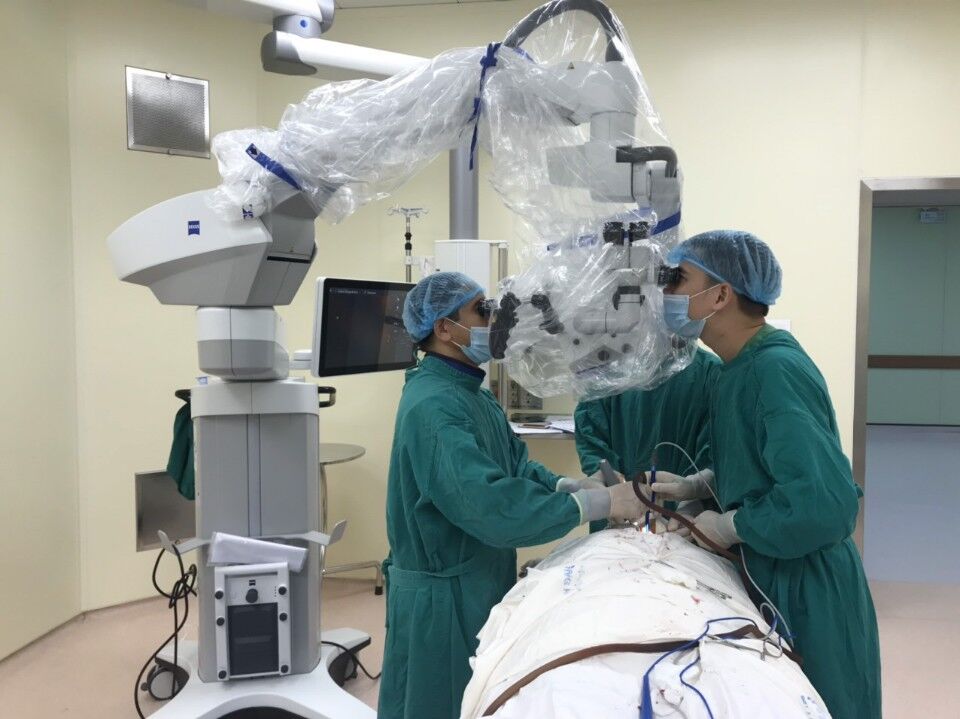 Đại tá, bác sĩ Khuất Cao Kỳ (ngoài cùng bên trái) và ekip mổ thoát vị đĩa đệm cột sống cổ dưới kính vi phẫu.