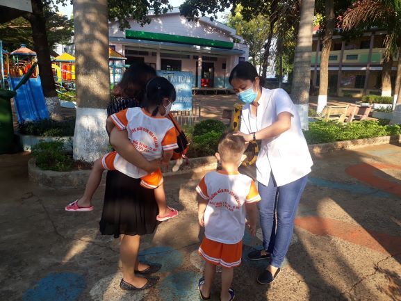 Tại trường mầm non Hoa Pơ Lang, phường EaTaM, TP Buôn Ma Thuột, công tác phòng chống dịch cho trẻ trước khi vào lớp được các giáo viên thực hiện các bước như: rửa tay sát khuẩn, đo thân nhiệt tại cổng trường, được ghi thông tin, nhiệt độ và yêu cầu các phụ huynh ký xác nhận.