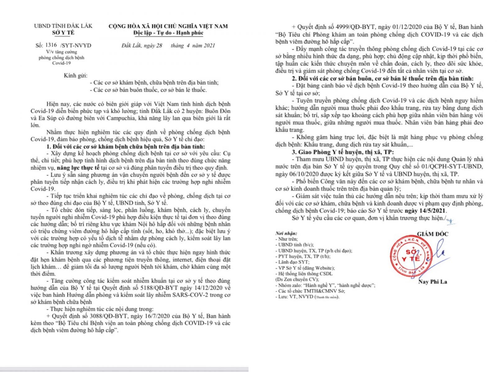 Trước tình hình dịch bệnh Covid-19 đang diễn biến hết sức phức tạp tại một số nước Đông Nam Á và Ấn Độ, đặc biệt tỉnh Đắk Lắk có hai huyện Buôn Đôn và Ea Súp giáp ranh với Campuchia. UBND tỉnh Đắk Lắk, các sở, ban ngành đã có nhiều công văn chỉ đạo công tác phòng, chống dịch cũng như khuyến cáo khả năng lây nhiễm cao.