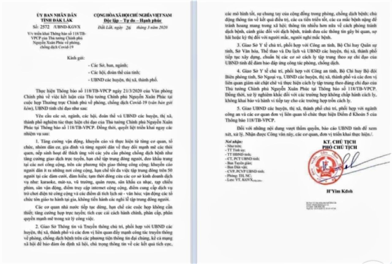 Hôm nay 26/3, UBND tỉnh Đắk Lắk ra công văn số 2527/UBND-KGVX, tạm thời đóng cửa các cơ sở kinh doanh dịch vụ như: karaoke, massage, vũ trường, quán rượu, sân khấu ca nhạc, rạp chiếu phim, sân vận động, điểm truy cập internet công cộng, điểm cung cấp dịch vụ trò chơi điện tử công cộng và các điểm di tích lịch sử - văn hoá; vận động các tổ chức tôn giáo tu hành tại gia, không tiến hành các nghi lễ tập trung đông người.