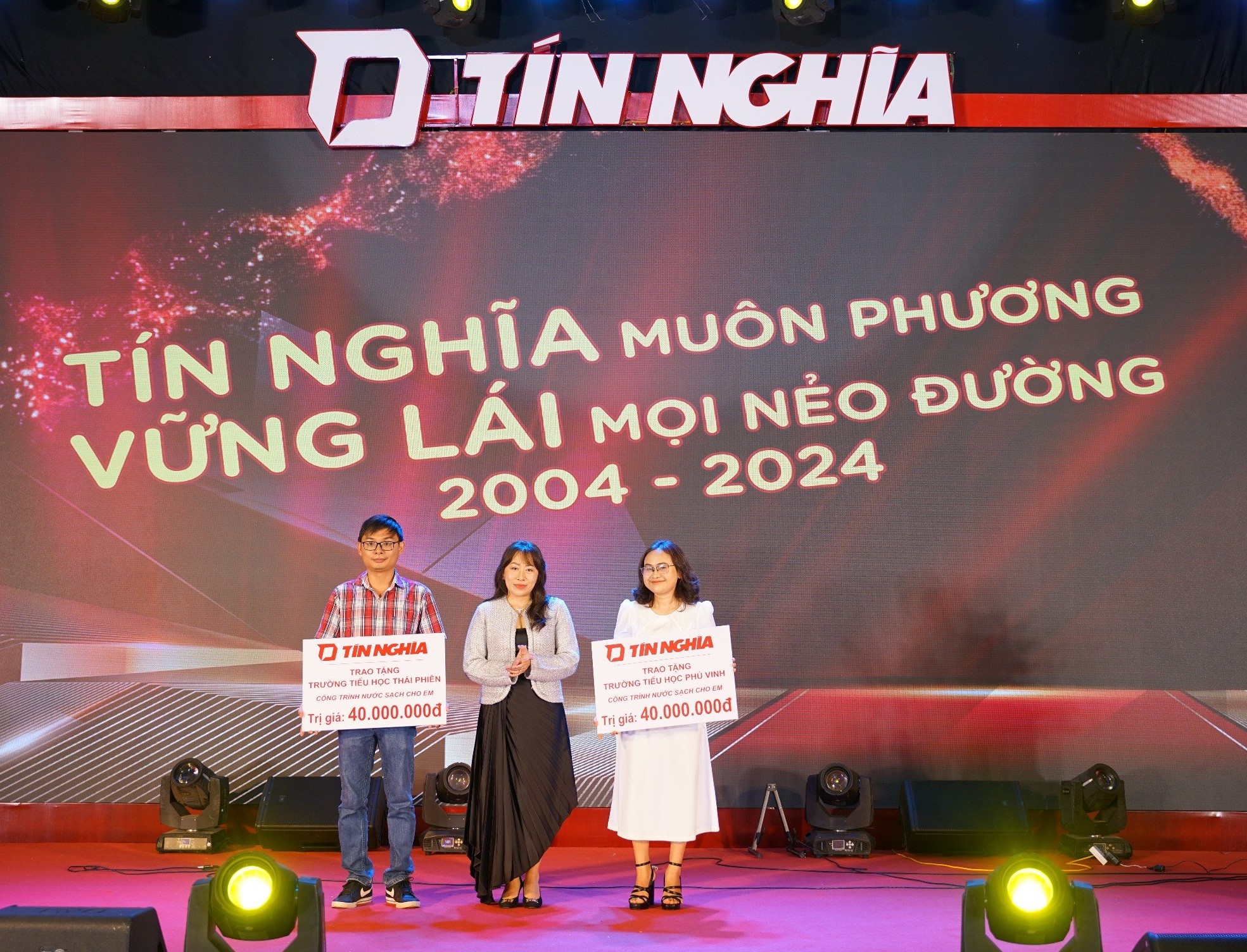 Đại diện công ty cổ phần Tín Nghĩa Logistics trao tặng 2 công trình nước sạch cho 2 trường tiểu học trên địa bàn thành phố Buôn Ma Thuột nhân dịp kỷ niệm 20 năm thành lập.