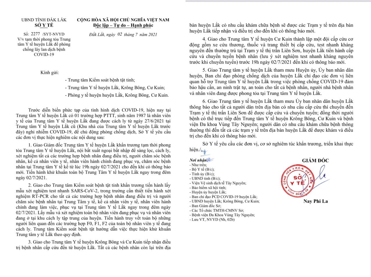 Sở Y tế chỉ đạo giao cho Trung tâm Y tế huyện Krông Bông và Cư Kuin tiếp nhận điều trị bệnh nhân cấp cứu đến từ huyện Lắk. Tất cả các bệnh nhân còn lại trên địa bàn huyện Lắk có nhu cầu khám chữa bệnh sẽ được các Trạm y tế trên địa bàn huyện Lắk tiếp nhận và điều trị cho đến khi có thông báo mới.