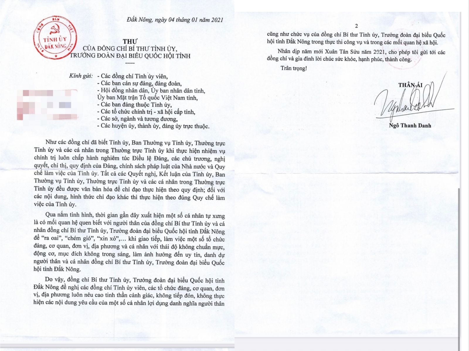 Ông Ngô Thanh Danh, Bí thư Tỉnh ủy Đắk Nông, trưởng đoàn Đại biểu Quốc hội tỉnh vừa có thư gửi tới các sở, ngành và tổ chức cơ sở, cảnh báo tình trạng mượn danh ông để “chém gió”, “xin xỏ”, thậm chí nhằm mục đích không trong sáng.