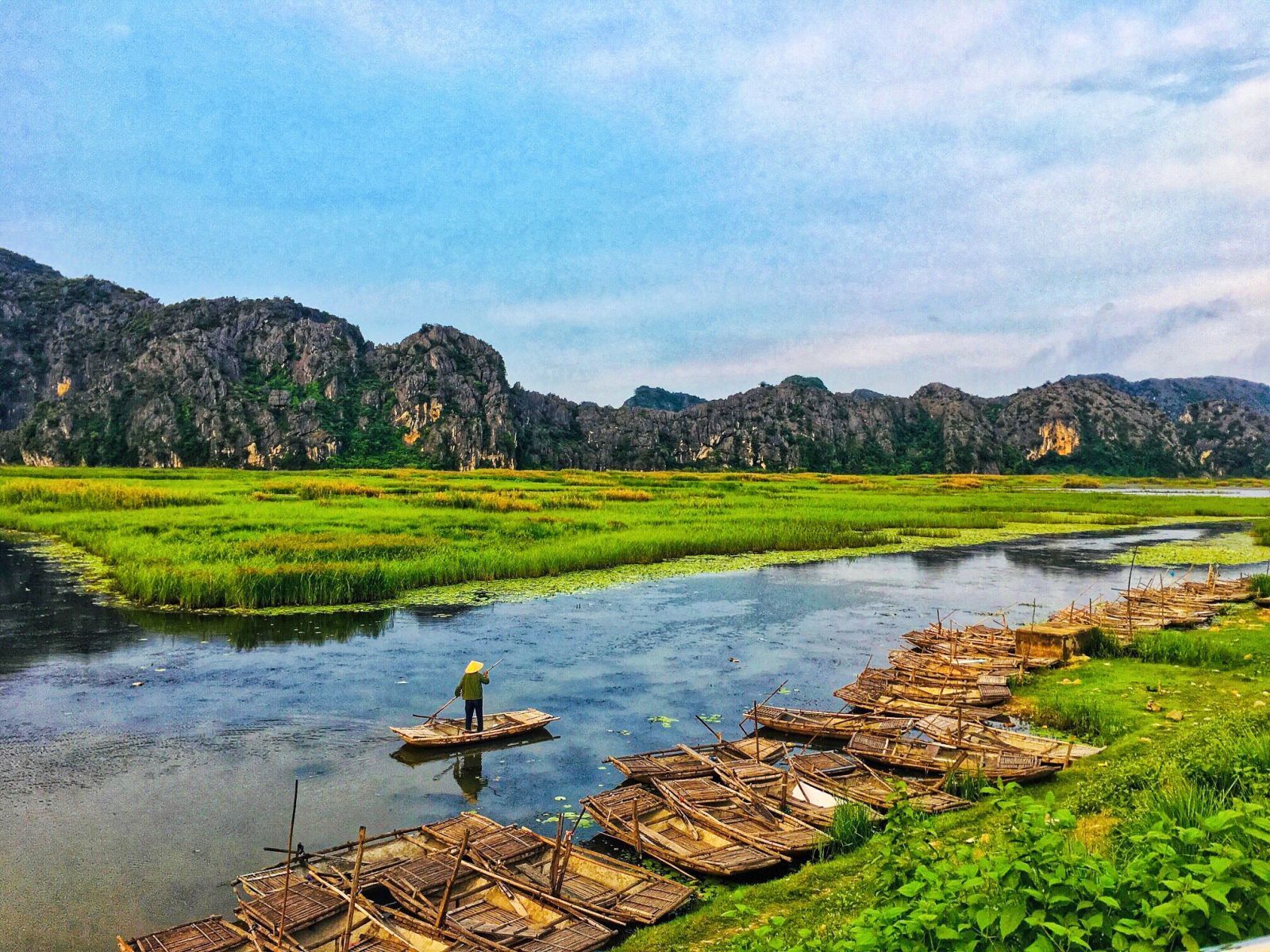 Sau khi tản bộ dọc triền đê, chúng ta sẽ xuống bến Vân Long, bắt đầu cuộc hành trình khám phá bức tranh đẹp đẽ. Trên chiếc thuyền nan đơn sơ, bạn thư thái ngắm núi đá sừng sững, những đám cỏ lác giữa đồng nước mênh mông và lắng nghe muôn loài xao động giữa không gian thanh tịnh. Giữa thiên nhiên trong trẻo ấy, bạn thấy mình như đang trôi trong miền cảm xúc yên ả, mọi mệt mỏi dường như tan biến, chỉ còn lại sự trầm trồ thán phục bàn tay nhào nặn của mẹ thiên nhiên dành cho vùng đất Ninh Bình.