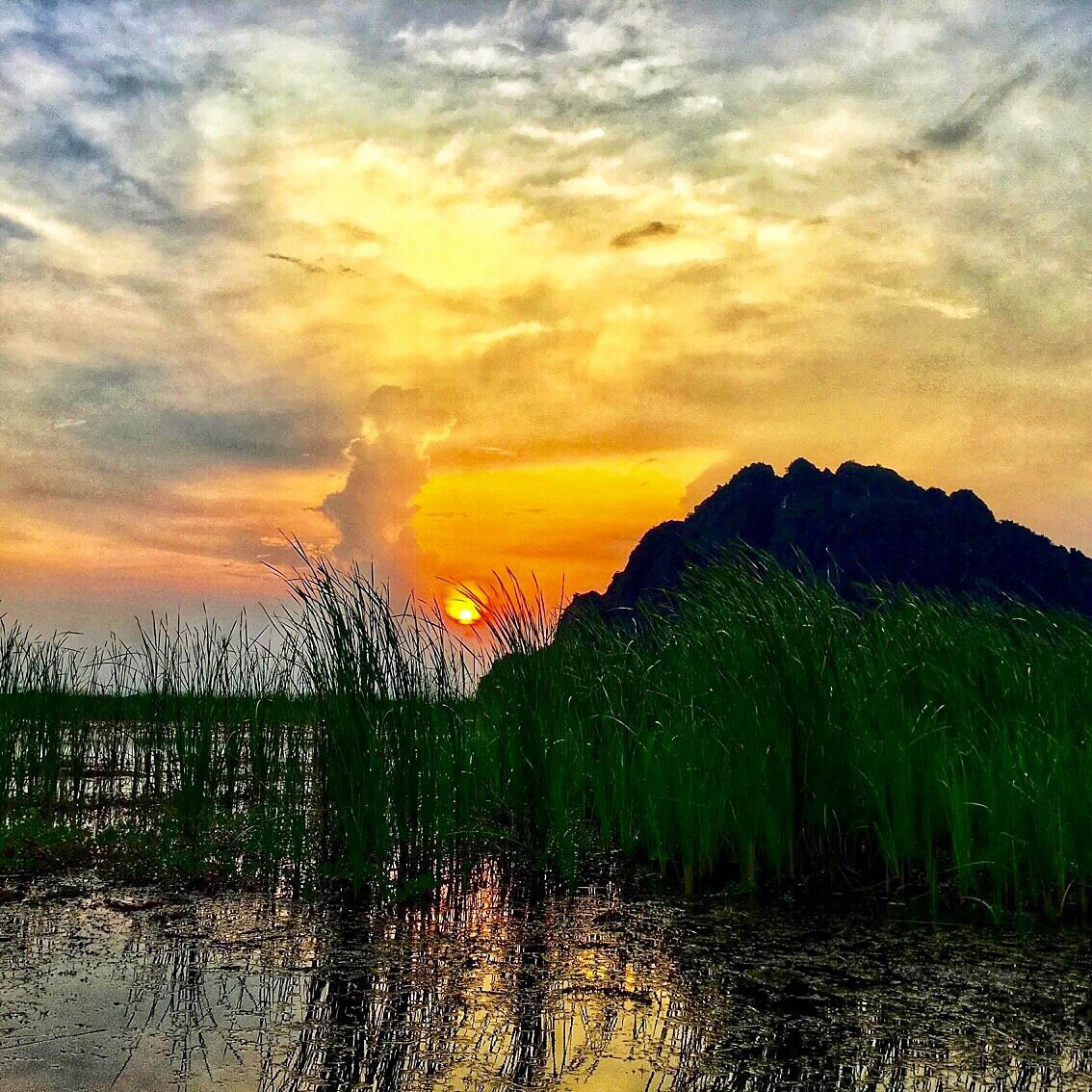 Mặt trời như một quả cầu lửa “e thẹn” lấp ló sau những dãy núi sừng sững giữa vùng cỏ lác um tùm