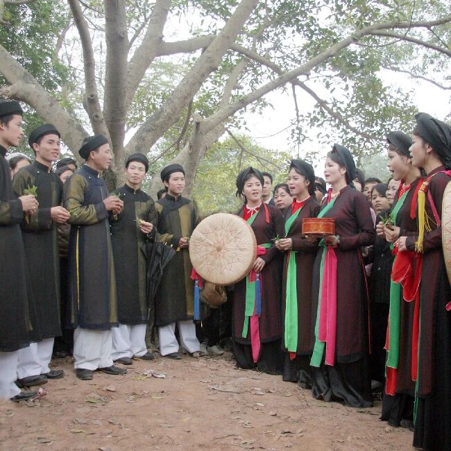 Và đối với người dân nơi đây, họ đã quen thuộc với hình ảnh các liền anh mặc áo dài 5 thân,dầu quấn khăn xếp ; các liền chị với “ áo mớ ba mớ bảy ” chít khăn mỏ quạ, đội nón quai thao, và thắt lưng đeo dây xà tích, đứng thành từng tốp nhỏ hát đối với nhau mỗi dịpTết đến hay Thu sang.