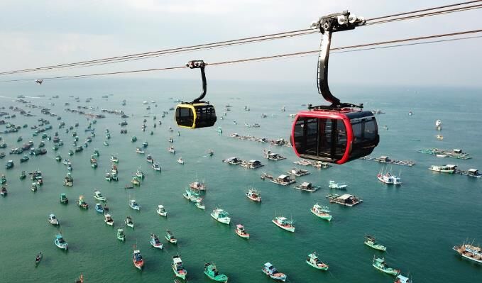 Cũng chỉ có Nam đảo mới đem đến cho du khách trải nghiệm chiêm ngưỡng toàn cảnh biển đảo trên cao với cáp treo 3 dây dài nhất thế giới. Cabin cáp treo mát lộng gió biển, qua khung cửa kính, mênh mông biển xanh màu ngọc, đảo biếc màu rừng, bình yên những làng chài, bập bềnh từng đoàn thuyền đánh cá trên sóng, thi thoảng, có chiếc cano lướt êm, vẽ lên mặt nước xanh ngoài xa khơi những vệt sóng như nét phác họa đầy phóng khoáng.