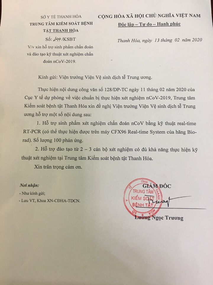 VNHN- Ngày 13/02/2020, ông Lương Ngọc Trương Giám đốc Trung tâm kiểm soát bệnh tật tỉnh Thanh Hóa đã ký văn bản gửi Viện trưởng Viện Vệ sinh Dịch tễ Trung ương, về việc: Đào tạo cán bộ xét nghiệm bệnh Covid - 19 và hỗ trợ một số sinh phẩm xét nghiệm chẩn đoán bệnh Covid - 19 bằng kỹ thuật real-time RT-PCR.