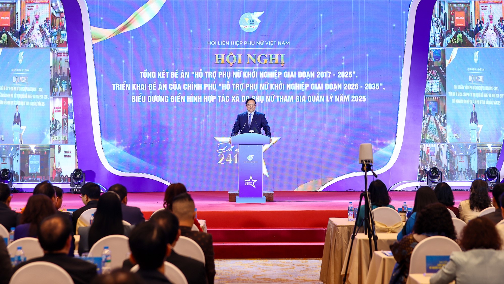 Thủ tướng Phạm Minh Chính dự và phát biểu tại Hội nghị tổng kết Đề án "Hỗ trợ phụ nữ khởi nghiệp giai đoạn 2017-2025 - Ảnh: VGP