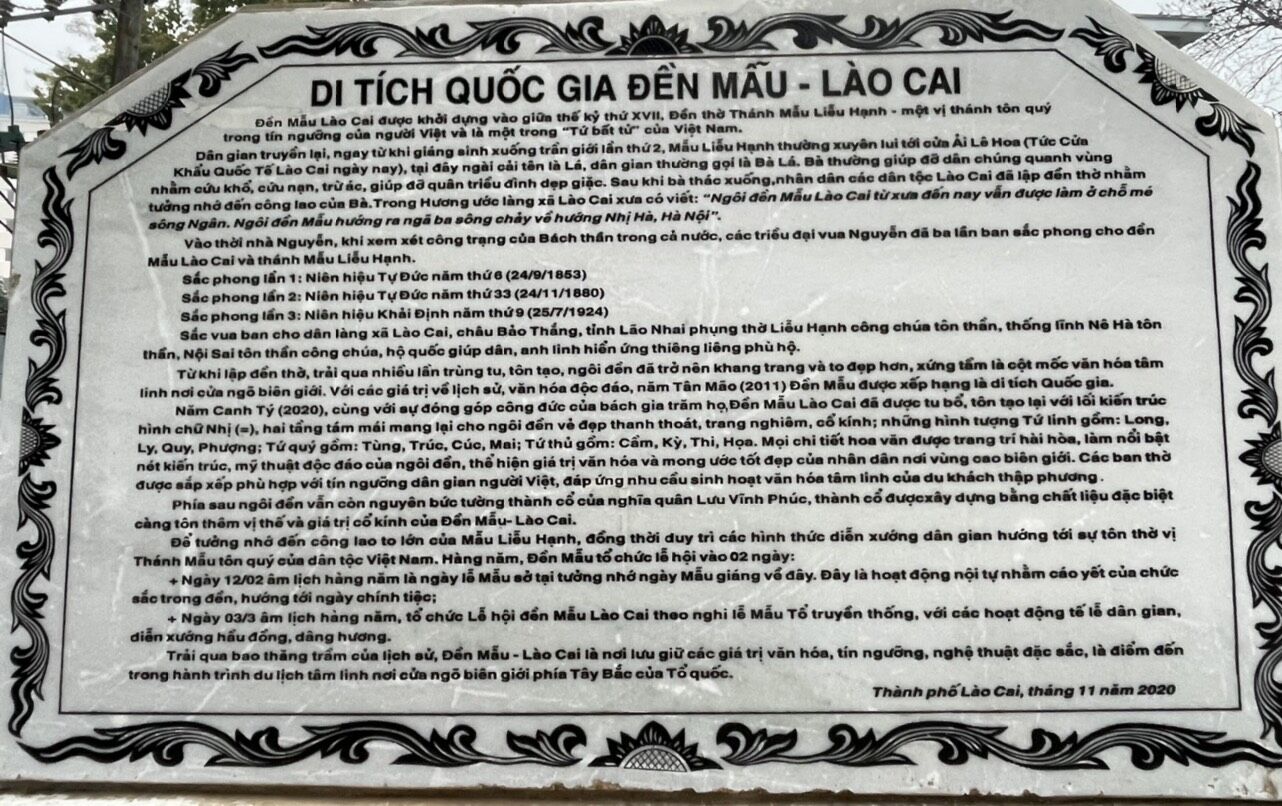 Đền Mẫu tại thành phố Lào Cai được nhân dân Lào Cai xây dựng cách đây hơn 300 năm. Đền nằm ngay ngã ba sông Hồng và sông Nậm Thi gặp nhau, nơi có vị trí cửa ngõ biên giới quốc gia, cạnh trục đường giao thương hai nước Việt Nam - Trung Quốc.