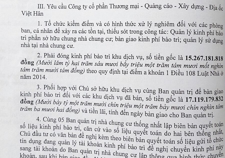 Công ty Việt Hân bị yêu cầu tổ chức kiểm điểm, xử lý nghiêm các phòng ban, cá nhân để xảy ra tồn tại, thiết sót; phải đóng hơn 15,2 tỷ đồng tiền phí bảo trì khu dịch vụ; phối hợp cùng chủ sở hữu khu dịch vụ bàn giao kinh phí bảo trì hơn 17,1 tỷ đồng cùng tiền lãi theo quy định cho ban quản trị.
