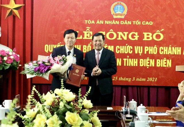 Vào ngày 25/3 Đồng chí Nguyễn Văn Du - Phó Chánh án TAND tối cao trao Quyết định số 91/QĐ-TATC ngày 22/01/2021 của Chánh án TAND tối cao về việc bổ nhiệm đồng chí Phan Văn Khanh, Thẩm phán Trung cấp, Chánh án TAND Thành phố Điện Biên Phủ giữ chức vụ Phó Chánh án TAND tỉnh Điện Biên, thời hạn bổ nhiệm 5 năm, kể từ ngày 01/02/2021.