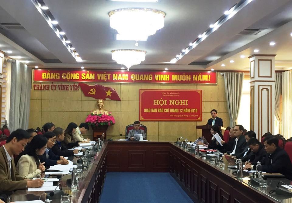 Vừa qua, ngày 6/12, Ban Tuyên giáo Tỉnh ủy Vĩnh Phúc tổ chức giao ban công tác báo chí tháng 12 năm 2019. Chủ trì hội nghị có đồng chí Ngô Khánh Lân, Tỉnh ủy viên, Phó trưởng ban thường trực Ban Tuyên giáo Tỉnh ủy. Cùng tham dự hội nghị có lãnh đạo các cơ quan báo chí của tỉnh, lãnh đạo Thành ủy, UBND thành phố Vĩnh Yên; đại diện các cơ quan báo chí Trung ương, báo ngành đóng trên địa bàn.