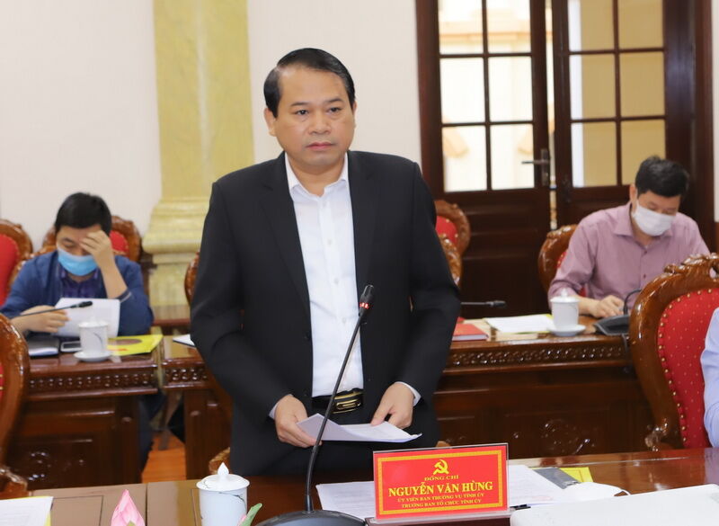 Trưởng Ban Tổ chức Tỉnh ủy Nguyễn Văn Hùng báo cáo tại buổi làm việc.