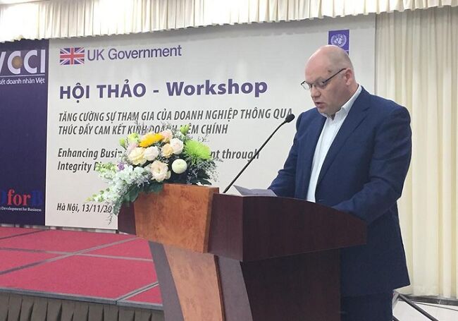 Ông Stephen Taylor, Trưởng Bộ phận Chính trị, Đại sứ quán Anh tại Hà Nội, đại diện cơ quan tài trợ nhấn mạnh: Sự kiện này ghi nhận sự cam kết của 11 doanh nghiệp trong việc thúc đẩy liêm chính doanh nghiệp tại Việt Nam.