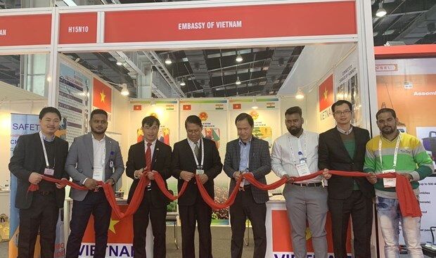 Cắt băng khai trương gian hàng Việt Nam tại hội chợ.