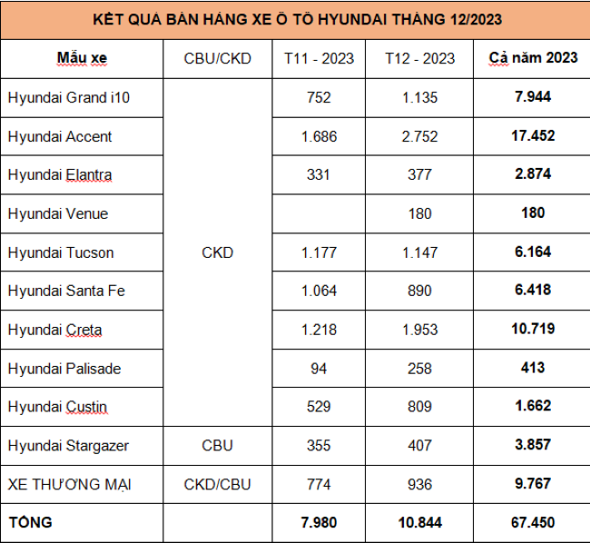 Kết thúc năm 2023, tổng số bán xe Hyundai đạt 67.450 xe. Đây là kết quả ghi nhận sự nỗ lực của TC Group, Hyundai Thành Công cũng như toàn thể hệ thống đại lý Hyundai trên toàn quốc. Năm 2024, khi các khủng hoảng toàn cầu dần qua được ổn định đi kèm với những dấu hiệu tích cực của thị trường với các chính sách hỗ trợ hiệu quả của chính phủ sẽ là cơ sở để hoạt động sản xuất lắp ráp cũng như thị trường ô tô trong nước sẽ khởi sắc và tăng trưởng tốt.