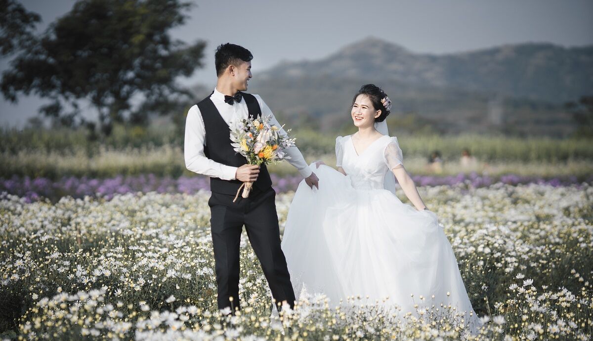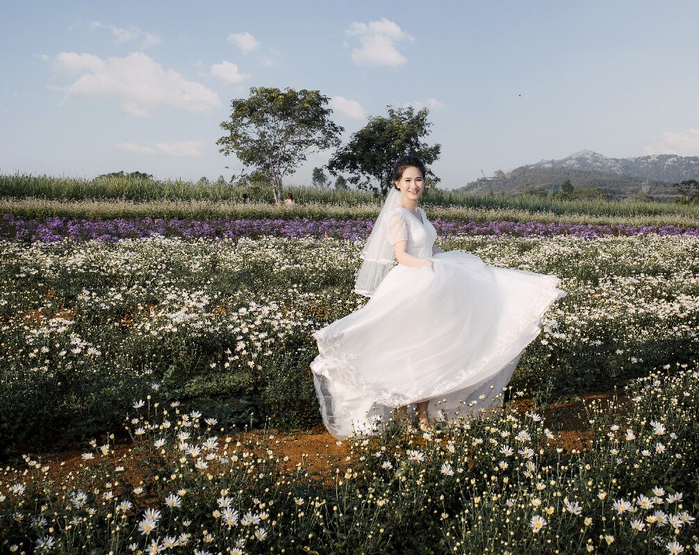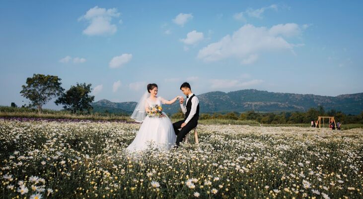 Những đôi tình yêu áo Soiree trắng vải gon lụa là lãng mạn, chú rể thanh tao với veston trắng nhẹ - cứ khoe mình trước nắng, trước thảm hoa cúc họa my trăng, theo đó là anh thợ quay phim, thợ ảnh say nghề bên hoa cỏ. Họ cố tìm và lưu giữ cho riêng mình những khoảnh khắc đẹp tại khôn gian hiếm và hót nhất để vun bồi cho hạnh phúc lứa đôi.