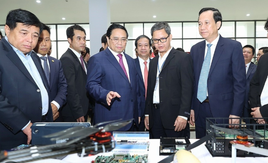 Thủ tướng Phạm Minh Chính tham quan trưng bày các sản phẩm nghiên cứu, chế tạo của Đại học Quốc gia Hà Nội cơ sở Hòa Lạc (14/3/2023). Ảnh: Dương Giang/TTXVN