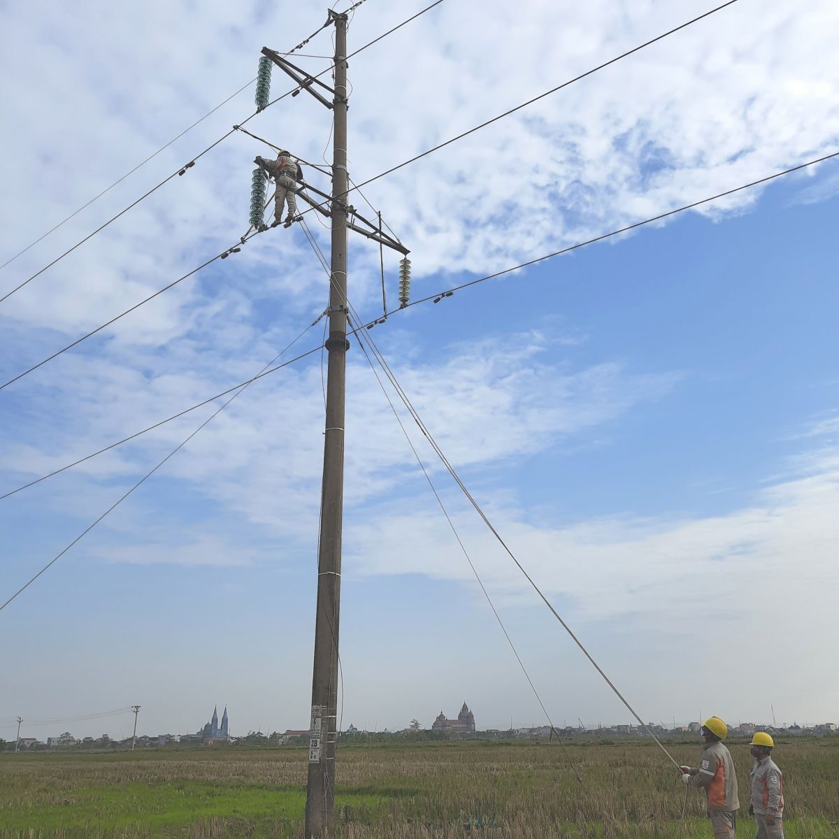 Công nhân thực hiện xử lý thay thế chuỗi sứ trên đường dây 110kV thuộc địa bàn huyện Nghĩa Hưng (Nam Định)