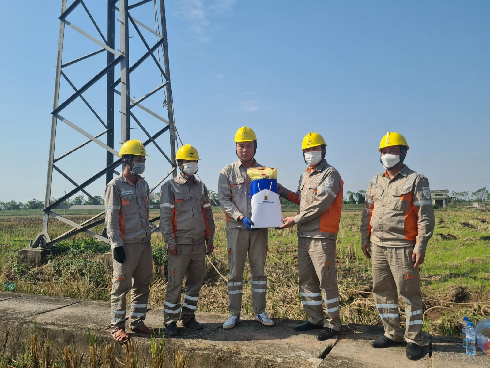 Phó Giám đốc Công ty Điện lực Nam Định Đỗ Văn Thiện kiểm tra hiện trường, trao quà động viên lực lượng công nhân tham gia củng cố lưới điện 110kV.