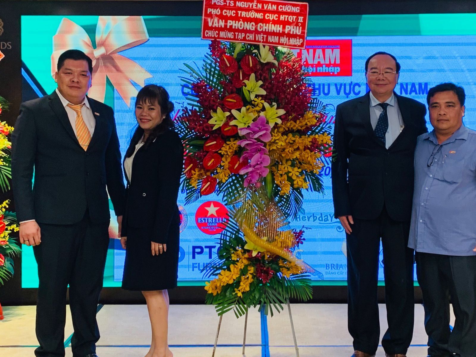 Ông Nguyễn Văn Lập cùng ông Nguyễn Trí Đức - Phó Trưởng Cơ quan Đại diện (Bìa phải) và Bà Nguyễn Hoàng Bảo Châu - Trưởng Ban Kinh tế, thay mặt CQĐD phía Nam nhận hoa chúc mừng từ PGS-TS. Nguyễn Văn Cường – Phó Cục trưởng Cục Hành chính Quản trị II, Văn phòng Chính phủ.