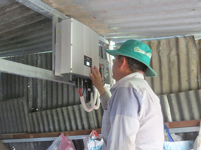 Hệ thống này cũng đơn giản, chỉ là những tấm pin năng lượng mặt trời trên mái nhà có kết nối với hệ thống tích trữ điện. Khoảng 8 giờ sáng, khi nắng lên là hệ thống hoạt động tốt và có thể dùng điện cho tưới vườn và sinh hoạt trong gia đình.