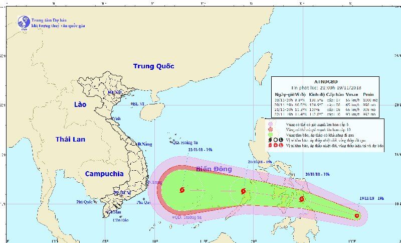 Trong 24 đến 48 giờ tiếp theo, bão di chuyển theo hướng Tây Bắc, mỗi giờ đi được khoảng 25km và vào Biển Đông. Đến 19 giờ ngày 21/11, vị trí tâm bão ở khoảng 11,3 độ Vĩ Bắc; 119,0 độ Kinh Đông, cách đảo Song Tử Tây (thuộc quần đảo Trường Sa) khoảng 480km về phía Đông. Sức gió mạnh nhất vùng gần tâm bão mạnh cấp 8 (60-75km/giờ), giật cấp 10. Cấp độ rủi ro thiên tai: cấp 3.
