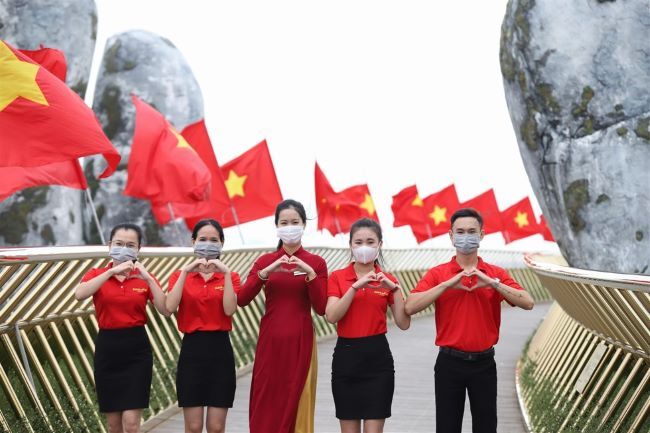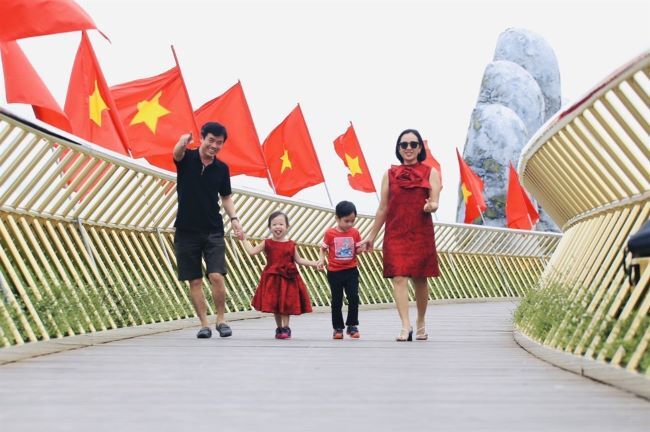 Suốt dọc Cầu Vàng, cờ đỏ sao vàng tung bay rực rỡ. Chưa khi nào đứng trên cây cầu vốn đã làm nên biểu tượng của du lịch Đà Nẵng và Việt Nam hai năm qua, du khách lại thấy tự hào đến thế.