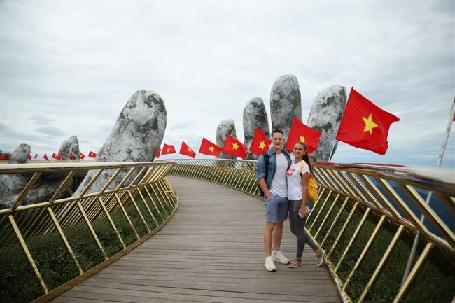 Rất nhiều du khách ấn tượng với hình ảnh cây Cầu Vàng rực rỡ cờ đỏ sao vàng tung bay. Andrew- một chuyên gia người Anh cho biết, anh sẽ gửi tấm hình chụp với bạn gái về cho người thân trong gia đình, với lời nhắn nhủ: “Việt Nam an toàn, Bà Nà vô cùng tuyệt vời”.