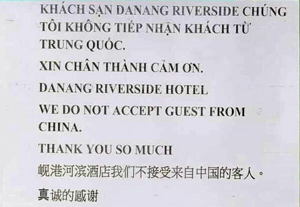 Nội dung thông báo từ chối nhận khách từ Trung Quốc của khách sạn Đà Nẵng Riverside.