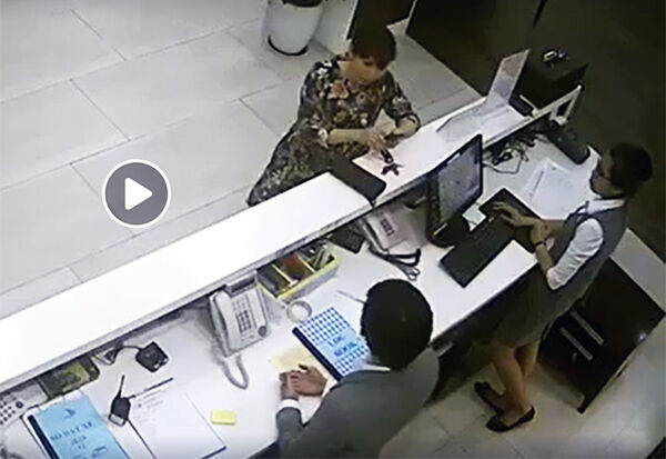 Bà Hồng Hạnh trao đổi với lễ tân khách sạn Đà Nẵng Riverside. (Ảnh chụp từ clip camera)