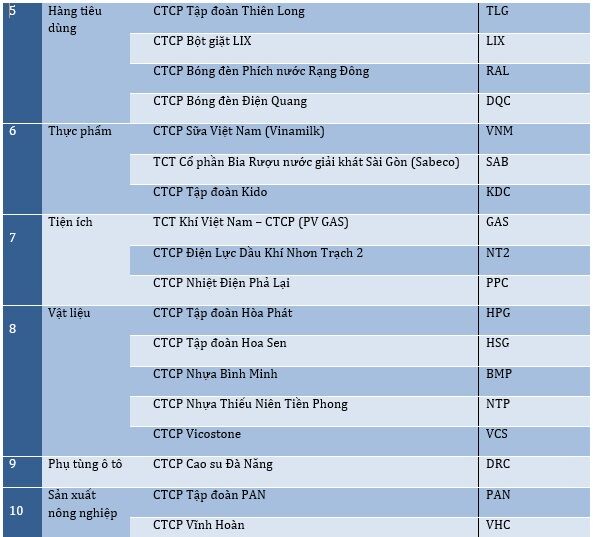 Trong khi đó, các tên tuổi lớn như Tập đoàn Vingroup (bất động sản), Ngân hàng TMCP Ngoại thương Việt Nam và Ngân hàng TMCP Công thương Việt Nam (tài chính), CTCP Sữa Việt Nam - Vinamilk (thực phẩm), CTCP Tập đoàn Hòa Phát (vật liệu) tiếp tục được vinh danh trong top 50.