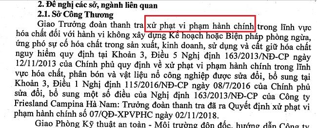 Bên cạnh đó, Friesland Campina có sử dụng 314 hóa chất các loại để phục vụ hoạt động sản xuất được lưu trong 07 kho với các hóa chất như NH3, Gas, HNO3…Theo quy định tại Điểm a, khoản 1, Điều 9 Thông tuư 32/2017/TT-BCT ngày 28/12/2017 của Bộ Công Thương về quy định và hướng dẫn thi hành một số điều luật của Luật hóa chất và Nghị định số 113/2017/NĐ-CP của Thủ tướng Chính phủ ngày 09/10/2017 thì Friesland Campina chưa thực hiện báo cáo tình hình hoạt động hóa chất.