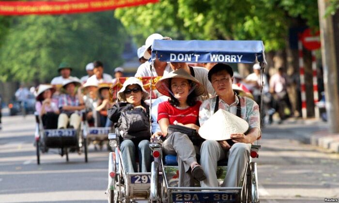 Ảnh du khách nước ngoài sử dụng xích lô theo đoàn tại Việt Nam.