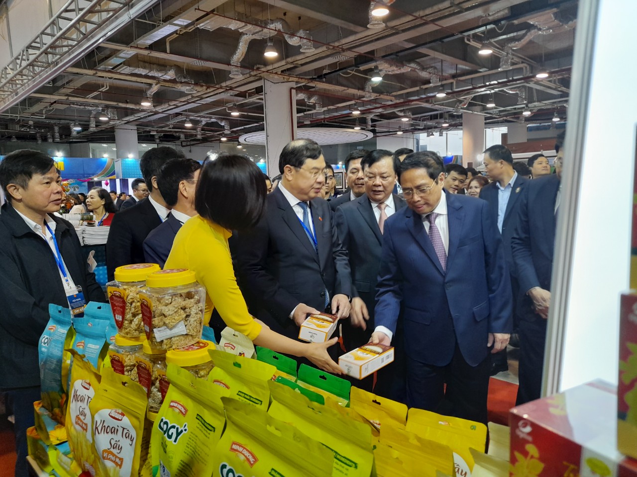 Thủ tướng chính phủ Phạm Minh Chính và các đại biểu thăm gian hàng sản phẩm tiêu biểu của tỉnh Nam Định đặc biệt là sản phẩm “Gạo sinh thái ruộng Rươi” của Công ty Toản Xuân