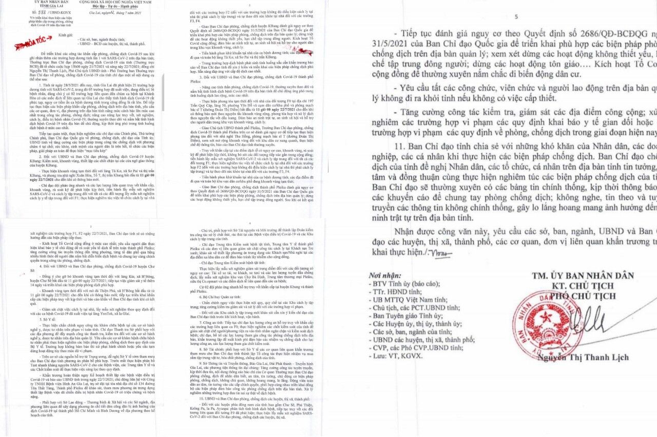 Đối với UBND và Ban Chỉ đạo phòng, chống dịch Covid-19 thành phố Pleiku: Nâng cao tinh thần phòng, chống dịch Covid-19, thường xuyên theo dõi và nắm bắt tình hình dịch bệnh Covid-19 trên địa bàn tỉnh để chủ động ứng phó trong tình huống dịch lan rộng, mức cao nhất. Thực hiện phong tỏa tạm thời đối với nhà của đối tượng F0 tại địa chỉ 197 Trần Quý Cáp, làng 50, phường Yên Đỗ và cụm dân cư/khu phố và phòng mạch bác sĩ T (đường Đoàn Thị Điểm) bắt đầu từ 11 giờ 00 ngày 22/7/2021 cho đến khi có thông báo mới theo nguyên tắc khoanh vùng rộng, phong tỏa hẹp và xử lý dịch theo nguyên tắc vết dầu loang. Đảm bảo an ninh trật tự, an sinh xã hội và hỗ trợ cho người dân trong khu vực khoanh vùng, cách ly.