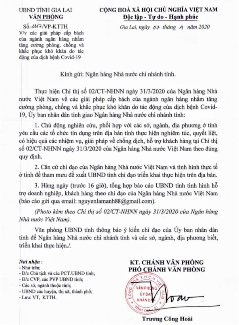 Trước tình hình đó ngày ngày 7/4 Văn phòng UBND tỉnh Gia Lai có công văn số 1117/VPUB-KTTH, gửi Ngân hàng Nhà nước chi nhánh tỉnh đề nghị tiền khai thực hiện chỉ thị số 02/CT-NHNN ngày 31/ 3 của Thống đốc Ngân hàng Nhà nước Việt Nam, về các giải pháp cấp bách nhằm khắc phục khó khăn do tác động dịch Covid-19. cơ cấu lại thời hạn trả nợ của khách hàng.