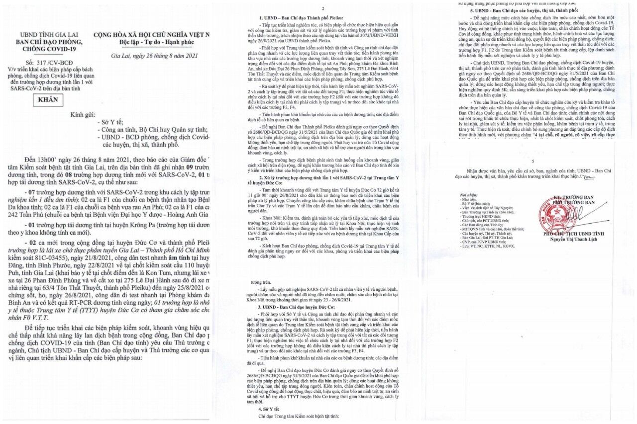 Ngày 26/8, Ban Chỉ đạo Phòng chống dịch Covid-19 tỉnh Gia Lai đã phát đi Công văn khẩn về việc triển khai các biện pháp cấp bách phòng, chống dịch Covid-19 liên quan đến trường hợp dương tính lần 1 với SARS-CoV-2 trên địa bàn tỉnh.
