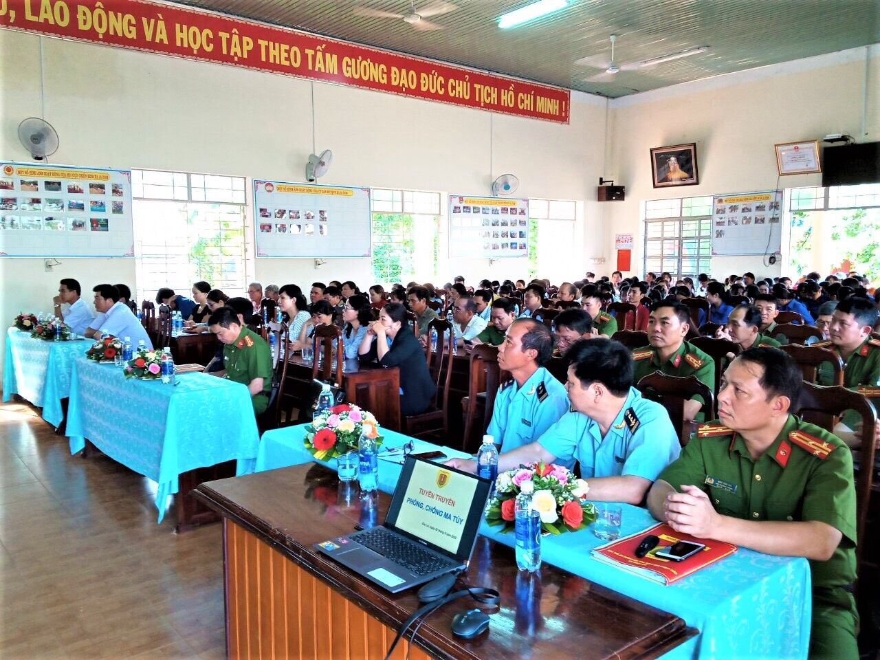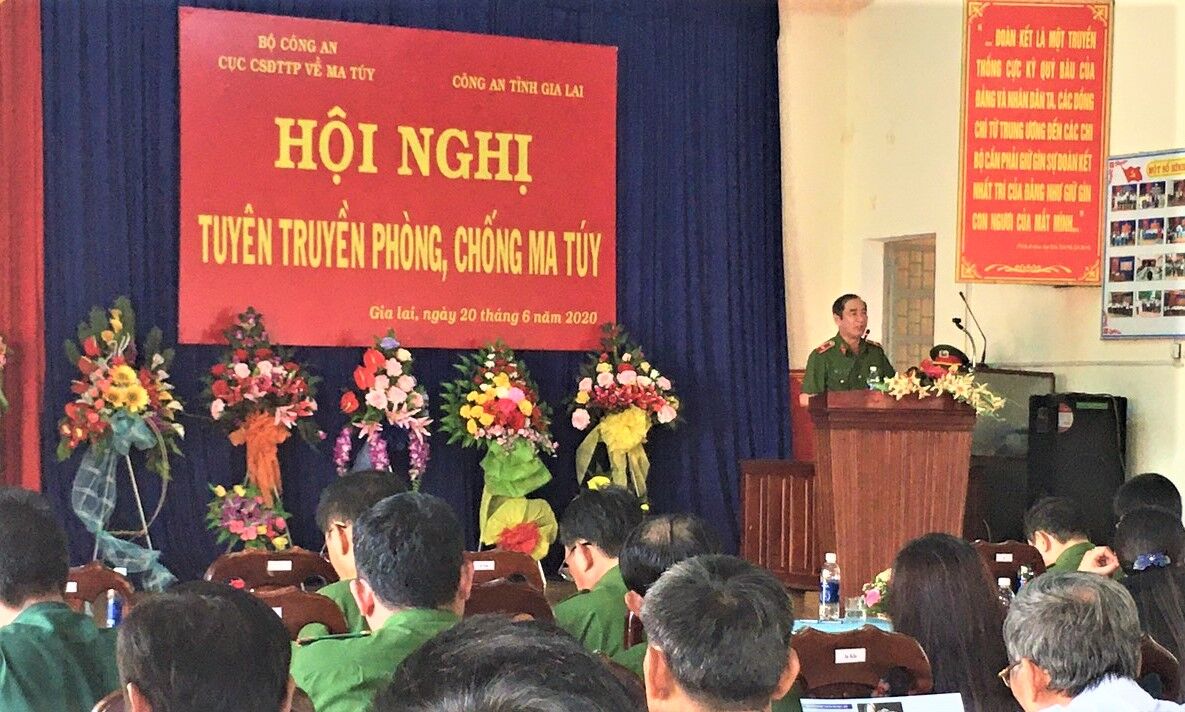 Đại diện lãnh đạo Công an tỉnh cũng đã báo cáo một số tình hình tội phạm ma tuý diễn ra trên biên giới khu vực Việt Nam và Campuchia nói chung, tình hình tội pham ma tuý trên địa bàn tỉnh Gia Lai nói riêng trong thời gian qua; dựa trên những kết quả đạt được, qua đó xây dựng những kế hoạch sắp đến như tuyên truyền, phổ biến về cách nhận biết một số loại ma tuý và tác hại của việc sử dụng ma tuý, từ đó đề nghị quần chúng nhân dân phải chung tay, quyết liệt trong cuộc đấu tranh phòng, chống, ma tuý đẩy lùi tội phạm ma tuý, không sử dụng, tiếp tay cho tội phạm liên quan quan đến ma tuý. Đồng thời khuyến khích khen thưởng tổ chức cá nhân khi phát hiện và tố giác tội phạm ma túy, cam kết giữ thông tin bí mật cho người cung cấp thông tin tội phạm, qua đó phối hợp với các cơ qua thông tấn báo chí, đài PTTH, Trung tâm văn hóa treo băng rôn nhằm thông tin đến bà con nơi công cộng trường học, Công ty. doanh nghiệp.