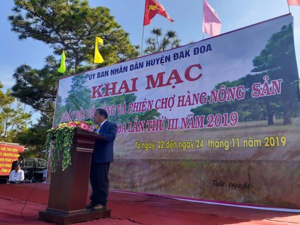 Ông Hoàng Nhưn - Phó Chủ tịch UBND huyện Đăk Đoa - Trưởng Ban tổ chức phát biểu khai mạc Ngày Hội. Ảnh: Bá Nha