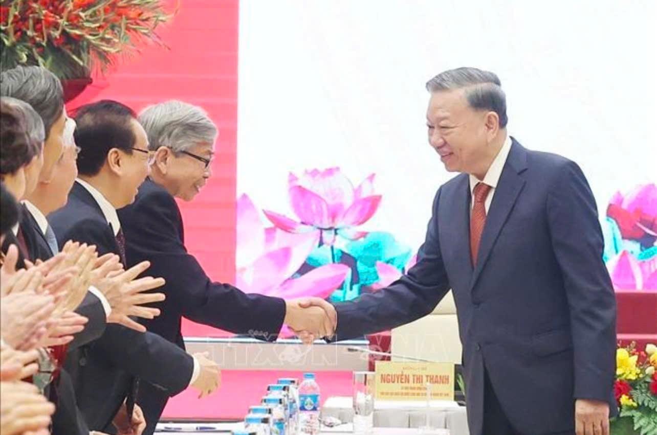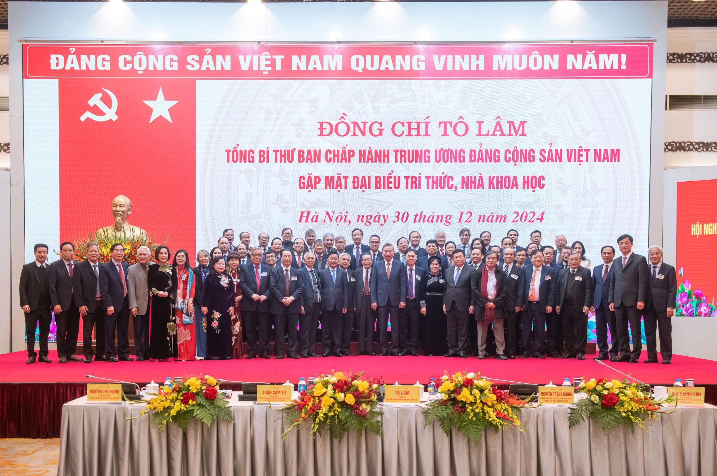 Tổng Bí thư Tô Lâm cùng các nhà khoa học Liên hiệp Hội Việt Nam tại buổi lễ gặp mặt trí thức, nhà khoa học (Tháng 12/2024)